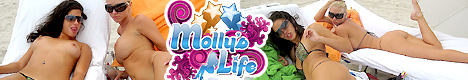 Busty blonde porn star Molly Cavalli and Asian babe Miko Sinz in sexy bikinis for Molly's Life, flash their nude boobs outdoors in public park while rollerblading and have interracial lesbian sex when back home